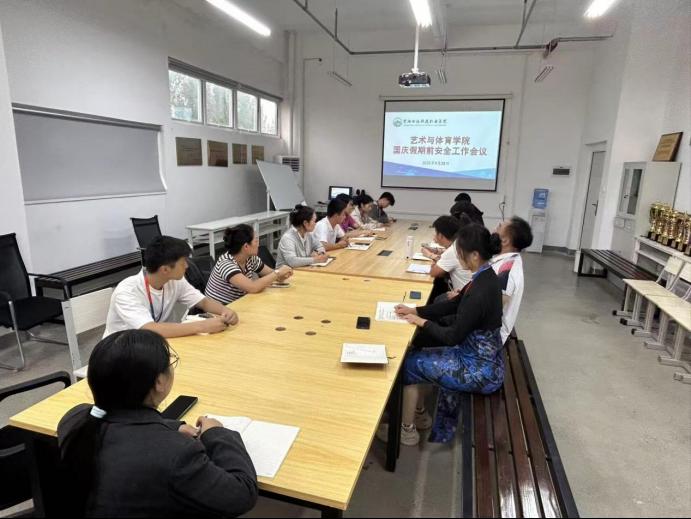 国庆、中秋节双节将至,为切实筑牢假期校园安全防线,压实安全管理责任,确保全院师生度过平安、祥和的假期,2025年9月28日,艺术与体育学院在学院会议室召开2025年国庆假期前安全工作专题会议。会议由学院实训中心主任曾玉洁主持,学院院长刘旭、学院党总支书记金旭强及教学科长、学工科长、各教研室主任(副主任)、学院各实训室安全管理员参会。