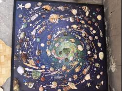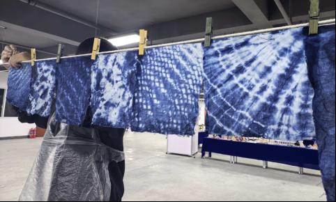 展览同时呈现了学生们对自然材料的深刻感悟。石头拼贴创意画利用天然石块的形态与肌理,重构出充满意境的画卷;非遗扎染则通过绞扎与浸染,在织物上幻化出如梦似幻的偶然纹样。二者共同诉说着“道法自然”的创作哲学。