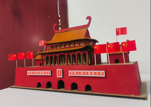 “美育铸魂”展区中央,一座精雕细琢的天安门建筑模型庄重屹立。学生团队运用专业技艺,严格推敲比例,精细还原细节。这一创作过程不仅是对中国经典建筑美学的深度学习,更是一堂沉浸式的“大思政课”,将爱国主义情怀与专业追求紧密融合。