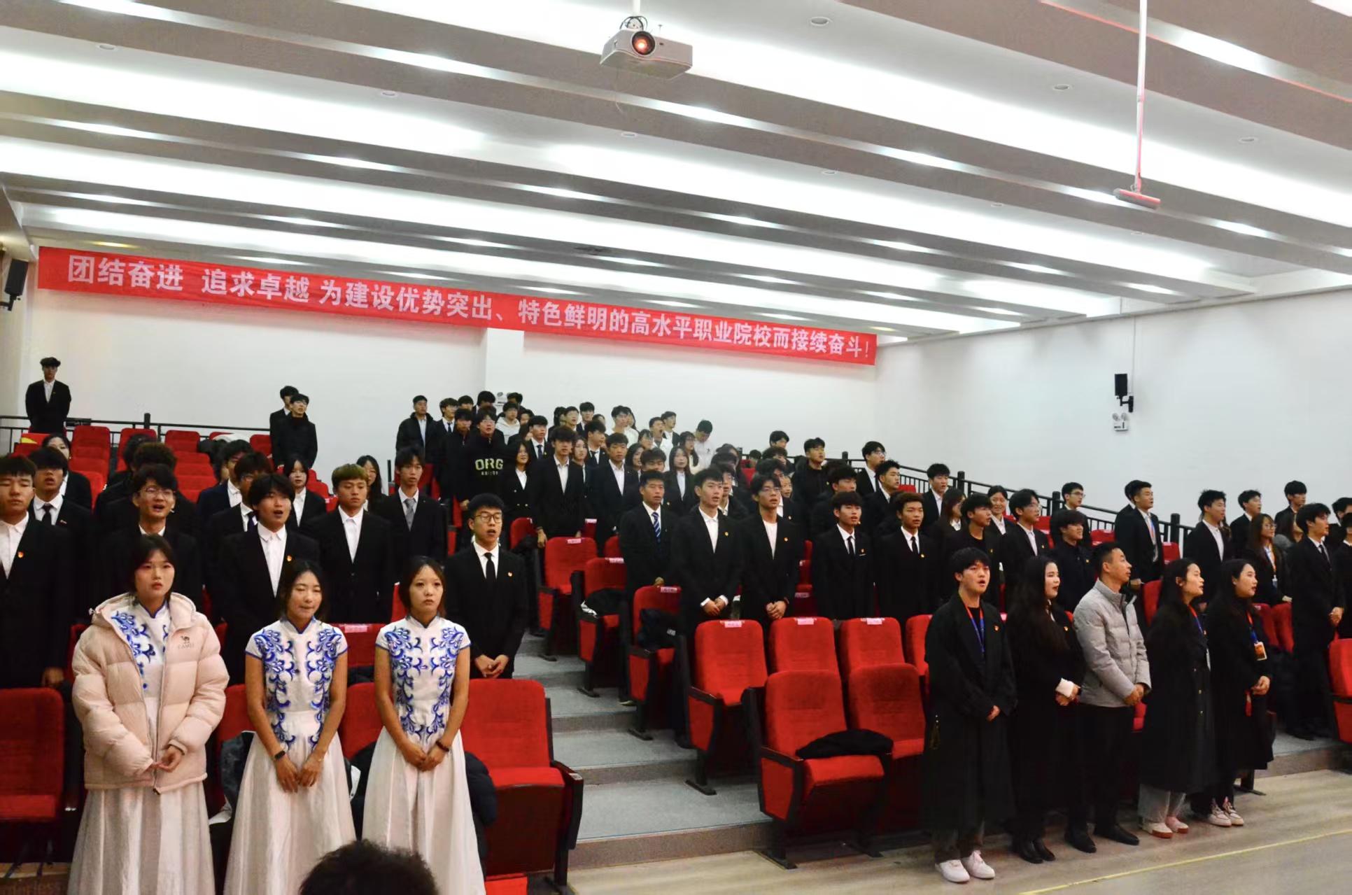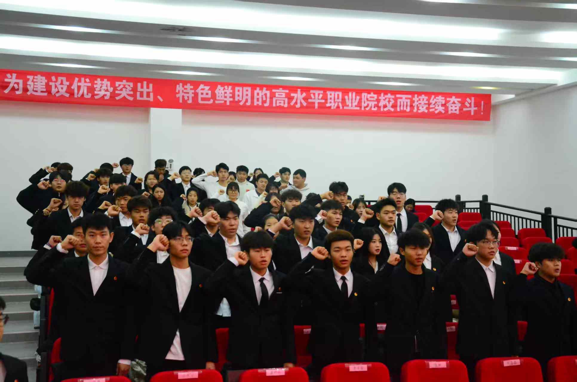 教室前方的电子屏滚动着“艺术与体育学院入团仪式”的字样,红色横幅“为建设优势突出、特色鲜明的高水平职业院校而接续奋斗”悬挂于后排墙面,同学们身着挺括的黑白正装,胸前的白色衬衫衬得精神格外昂扬,开场前的轻声交流里,藏着难掩的期待与庄重。
