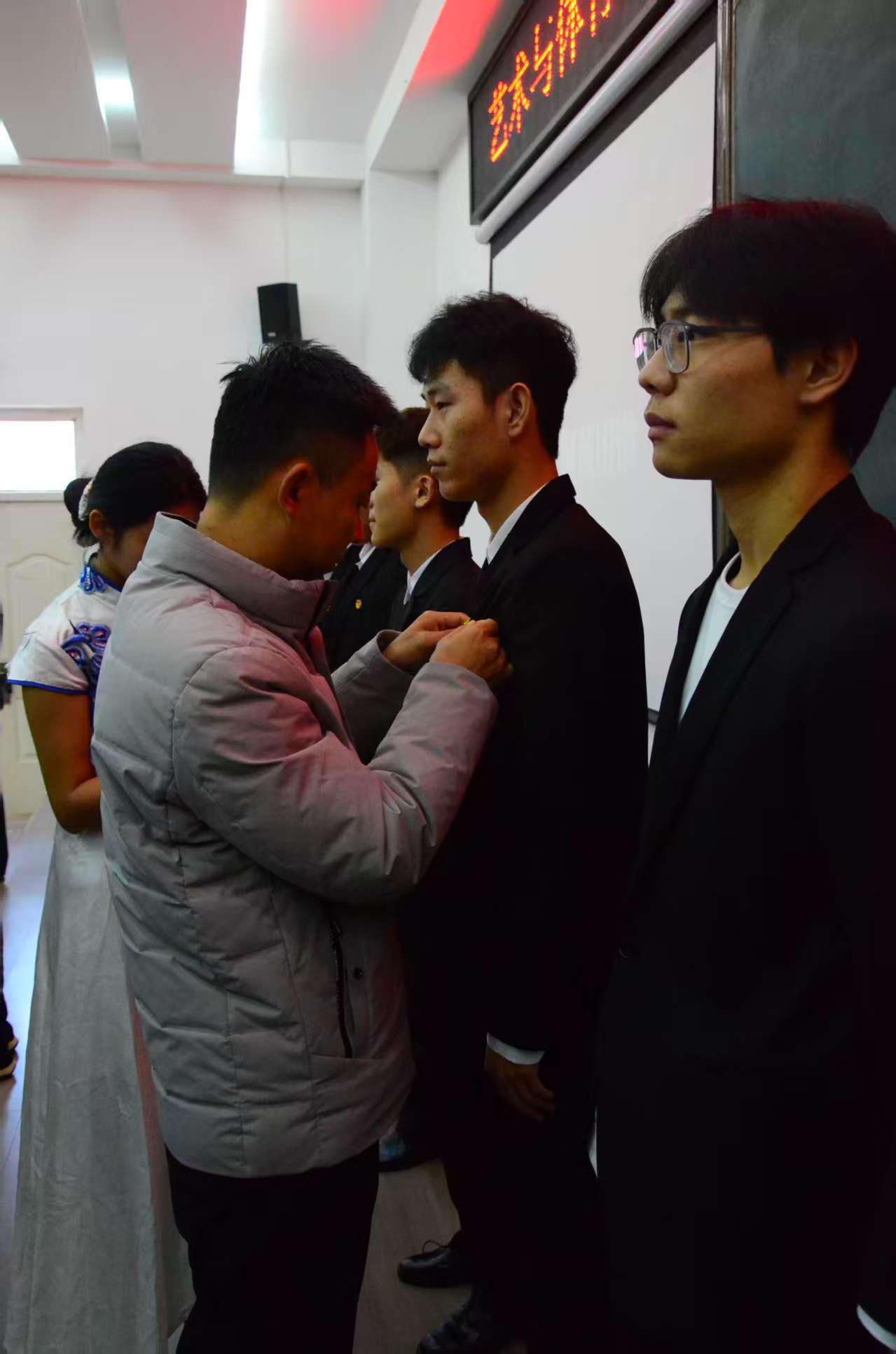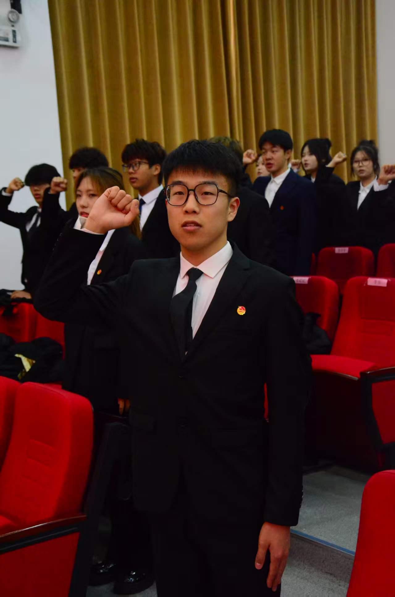 活动伊始,四名同学稳步走上讲台,双手稳稳托住鲜红团旗的边角,身姿挺拔如松——当金色团徽在顶灯的映照下亮起光泽时,现场瞬间安静下来,连呼吸都轻了几分。紧接着,学院党总支书记金书记,团总支书记赵书记和团成员们依次上前,为新团员逐一佩戴团徽:指尖轻扶着小小的金色团徽别在左胸,老师的声音轻而清晰:“团徽是荣誉,更是责任。”新团员们微微挺胸,眼神里既有紧张,更有藏不住的自豪。