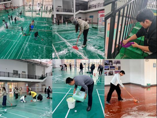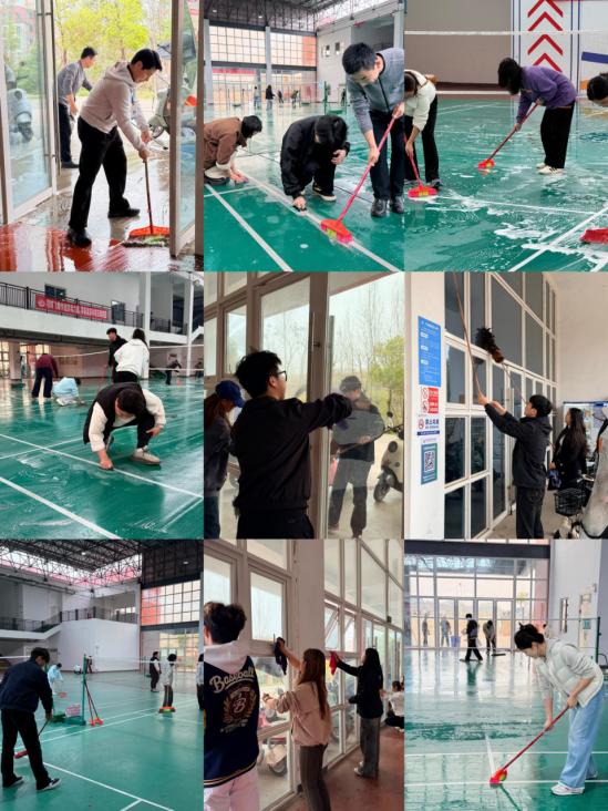 动员结束后,参与人员迅速分组、明确分工,带着扫帚、抹布、刷子和清洁剂等清洁工具,有序奔赴各个清洁区域,即刻掀起了热火朝天的劳动热潮。活动聚焦校园环境整治重点,精准发力、务求实效,全体参与人员重点对羽毛球场地进行细致清洁,大家手持刷子、蘸取清洁剂,弯腰俯身、耐心细致地一点一点刷洗羽毛球垫子,不放过垫子上的每一处污渍、每一个缝隙,反复擦拭、认真清理,全力让运动场地恢复洁净整洁、焕然一新;同时,大家分工协作,逐一擦拭校园公共区域的所有玻璃,细致清理玻璃表面的污渍与灰尘,让每一块玻璃都变得干净透亮,全方位还原校园整洁本色。